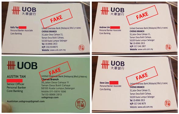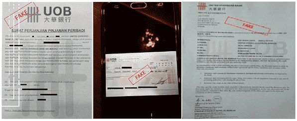 Scammers will also provide either a fake letter of offer, fake cheque (purportedly issued by UOB) as proof of loan approval, or fake UOB business card in order to appear legitimate.